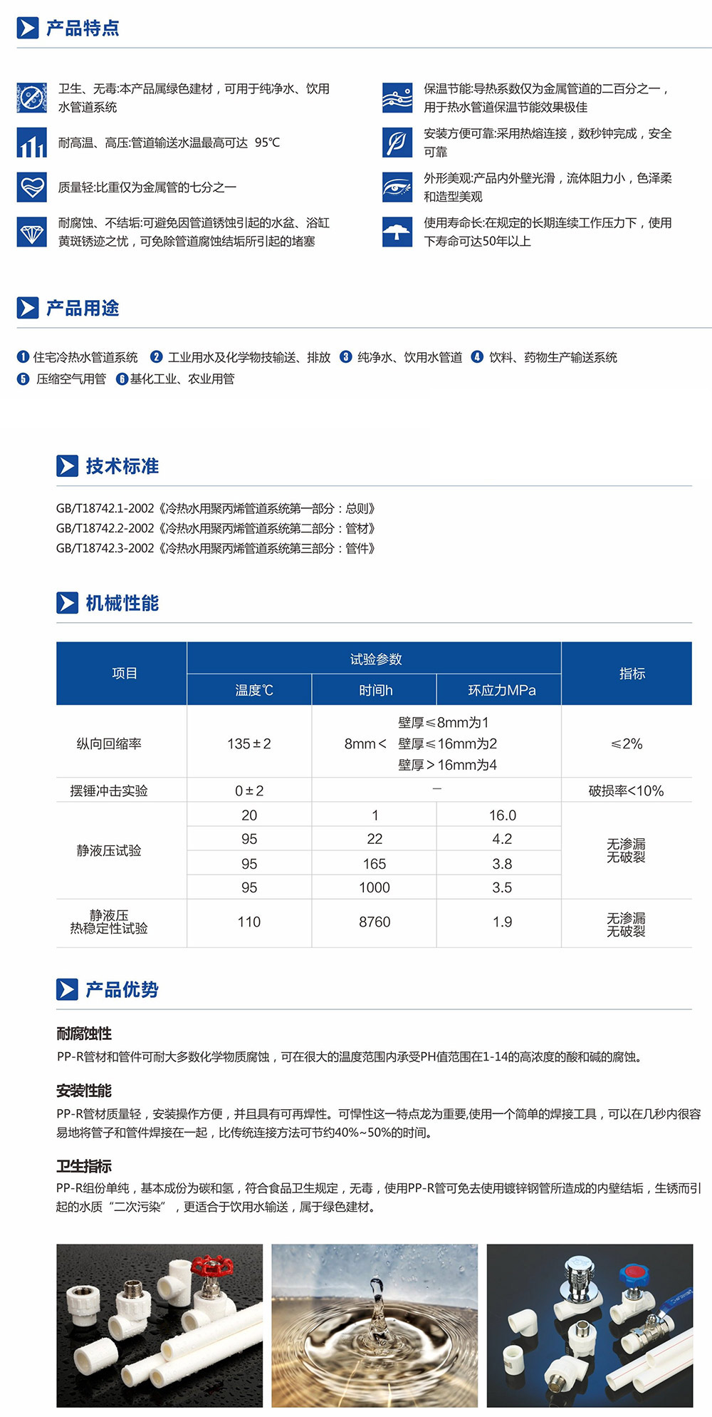 主要產品有:PVC電力穿線管、UPVC室內外排水管、CPVC高壓電力護套管、UPVC民用打井專用管、UPVC低壓通訊七孔梅花管、市政HDPE雙壁波紋管,