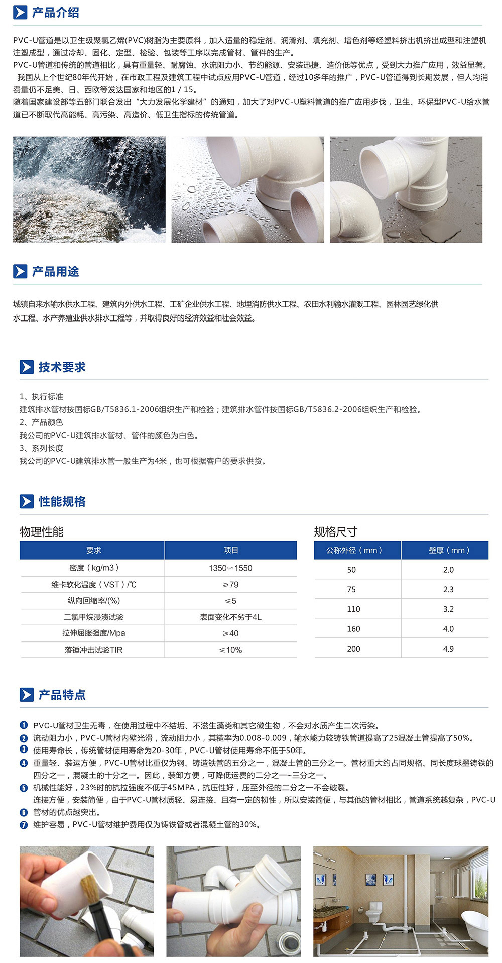 主要產(chǎn)品有:PVC電力穿線管、UPVC室內(nèi)外排水管、CPVC高壓電力護(hù)套管、UPVC民用打井專用管、UPVC低壓通訊七孔梅花管、市政HDPE雙壁波紋管,
